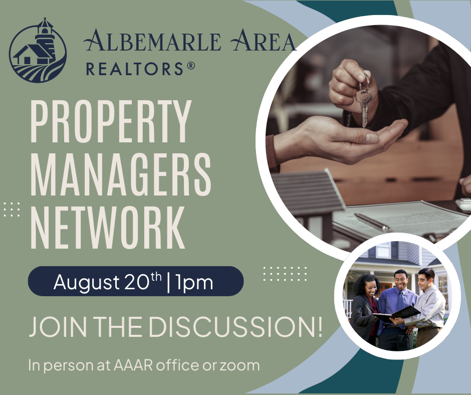 Calling all local property managers! Please join us for the next Property Managers Network meeting on Thursday, August 20th at 1:00 PM. This session will be held in person at the AAR® office or virtually via Zoom for those who prefer to attend remotely.