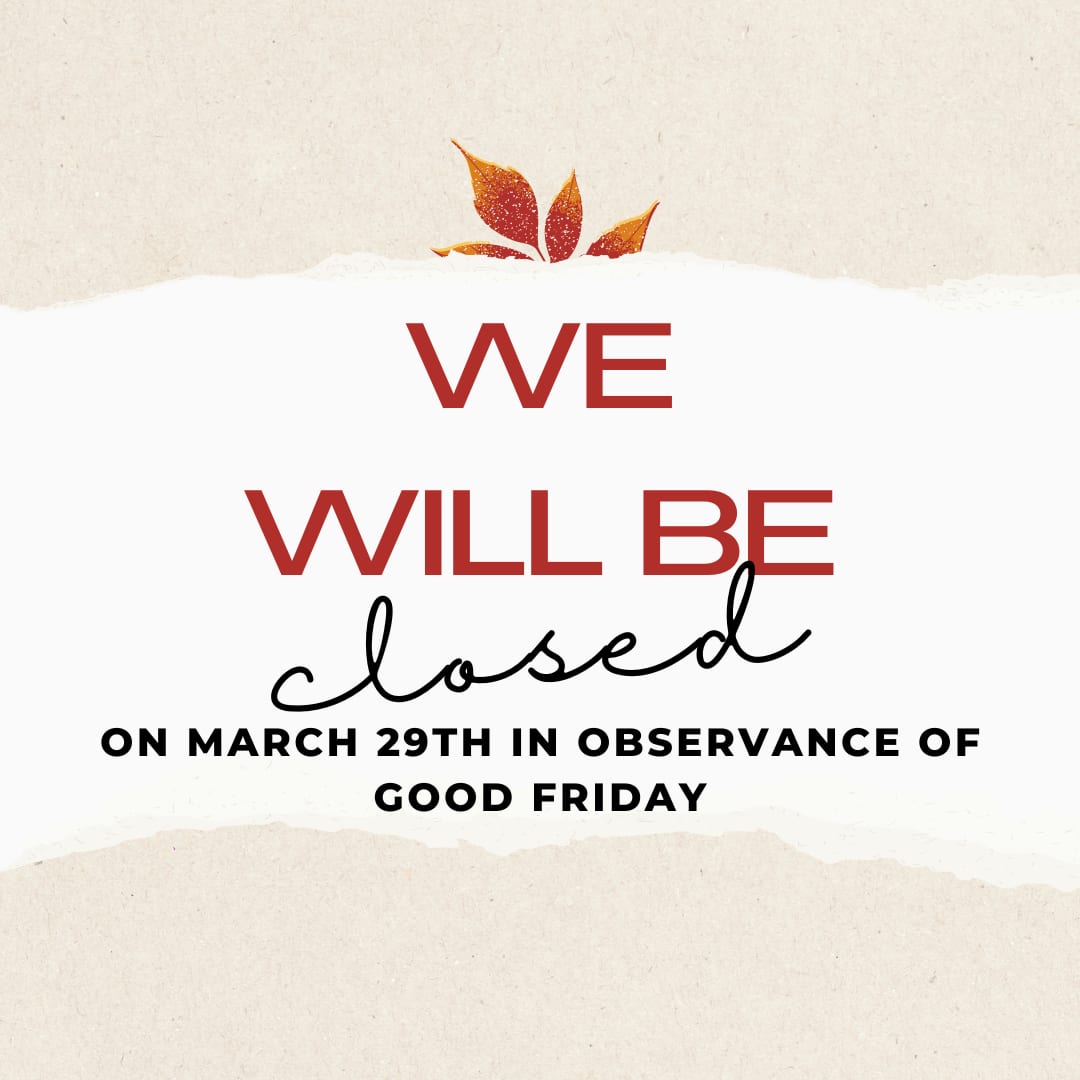 We will be closed on Friday, March 29th, in observance of Good Friday and will reopen on Monday morning at 8:00 a.m.