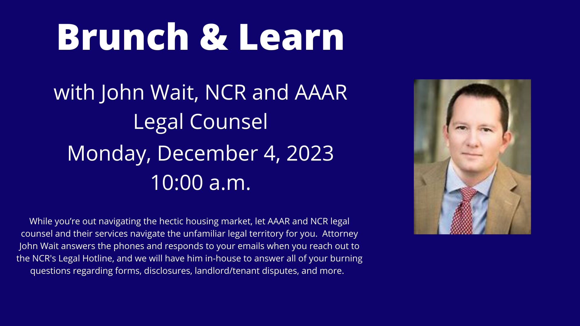 Join us for a Brunch & Learn with John Wait, AAAR and NCR Legal Counsel. John will answer all your burning questions about contracts, disclosures, landlord/tenant disputes, code of ethics issues, and much, much more!Images