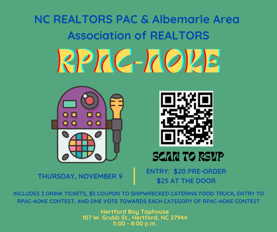 Join us at Hertford Bay Taphouse for a fun-filled Karaoke competition among our members, family, and friends! A $20 investment in RPAC ($25 at the door) will provide you with two drink tickets, a $5 coupon to the on-site food truck, entry into the RPAC-Aoke contest (optional), and one vote towards each category of the contest.