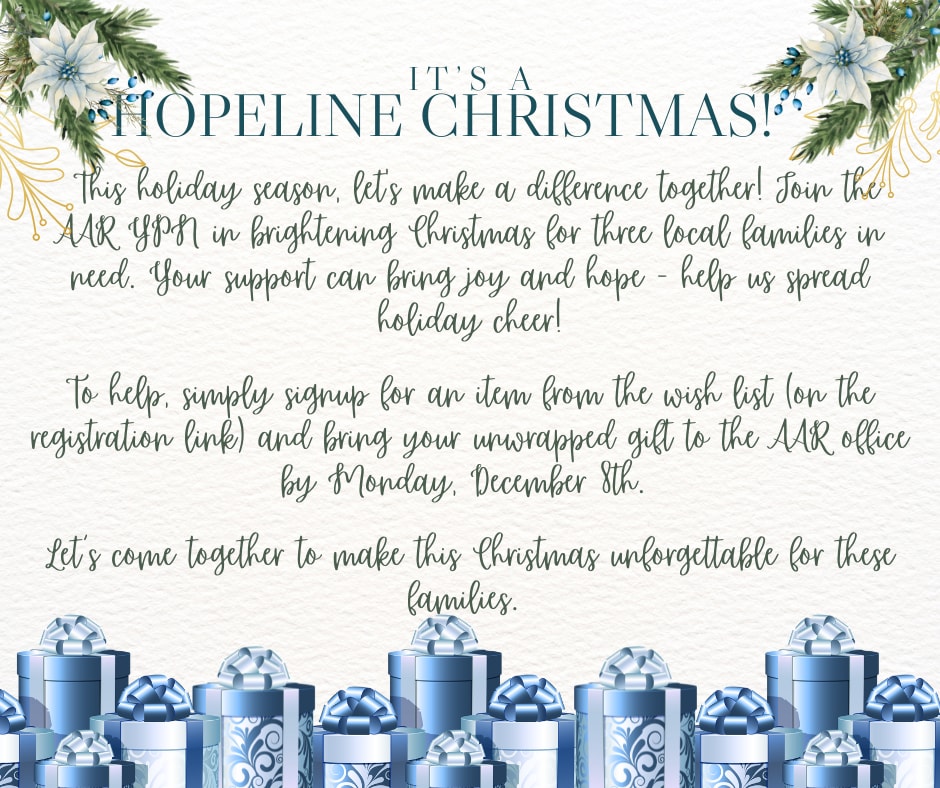 This year, let's make a difference together. Join the AAR YPN in brightening the holidays for some very deserving families in our community. Your support can bring joy and hope - help us spread some holiday cheer! To help, simply sign up for an item from the wish list and bring the unwrapped gift to the AAR office by Monday, December 8th. Let's come together to make this holiday season unforgettable for these families!